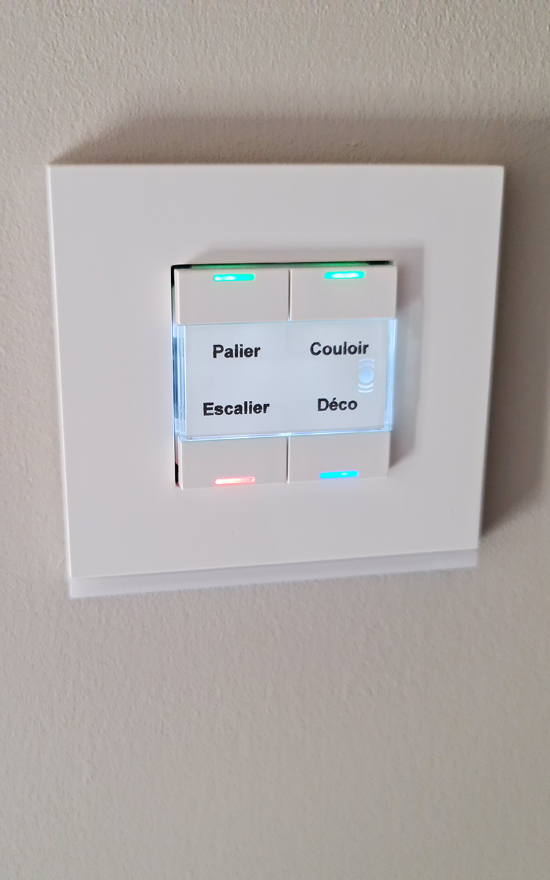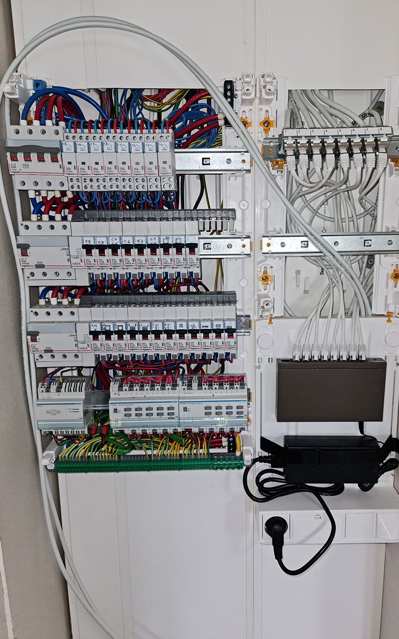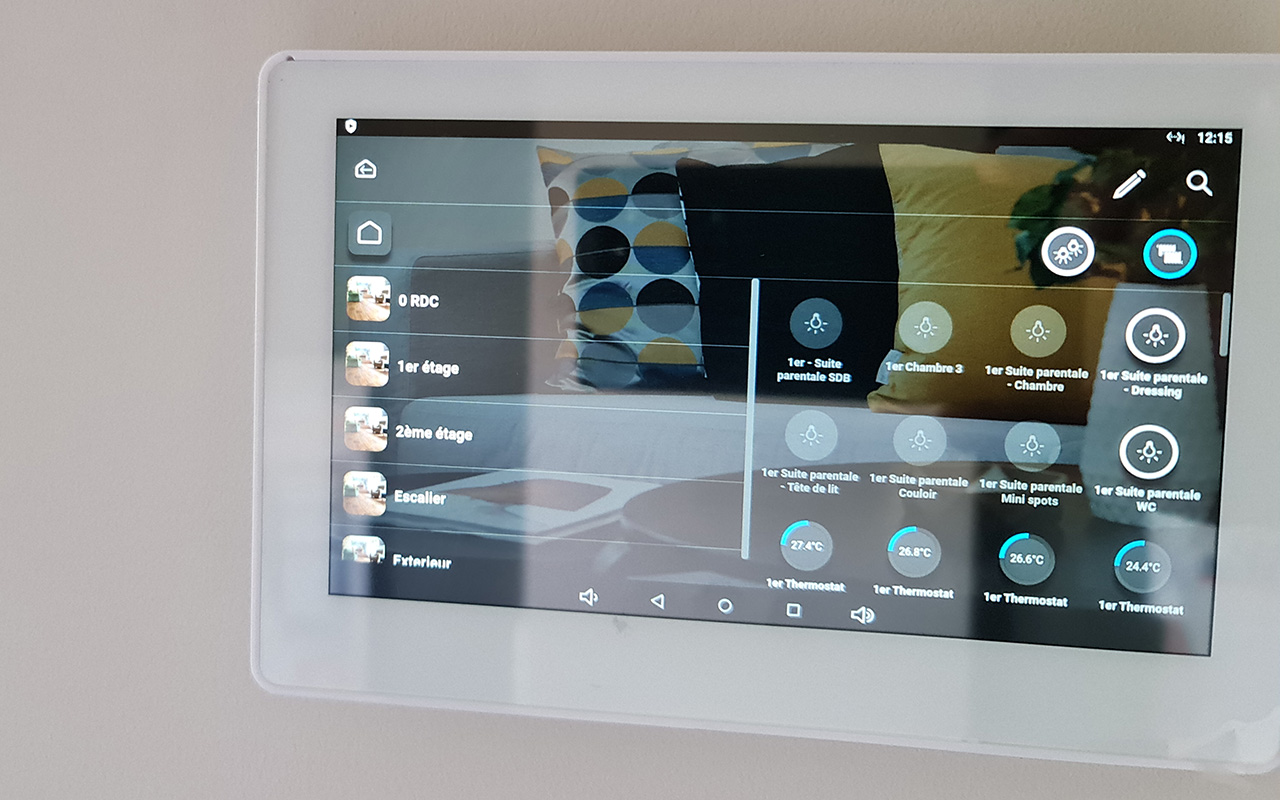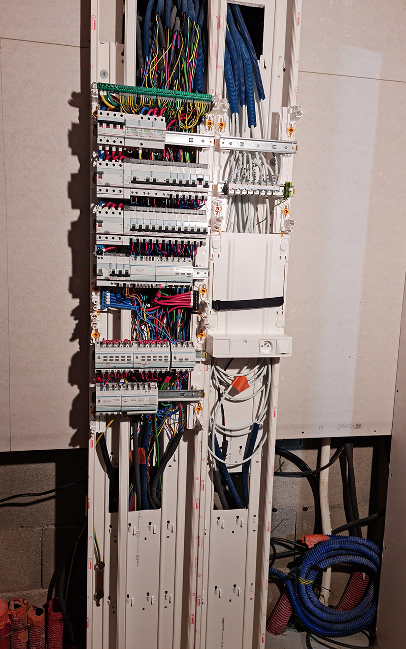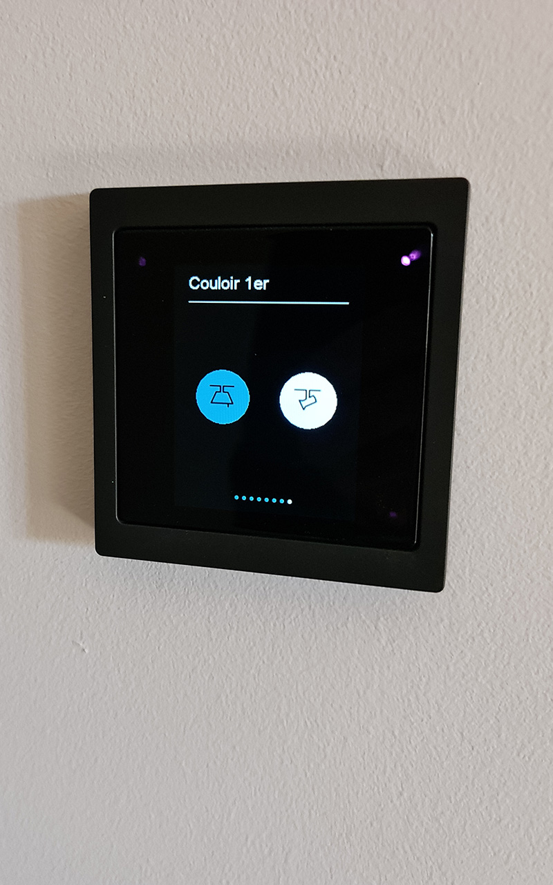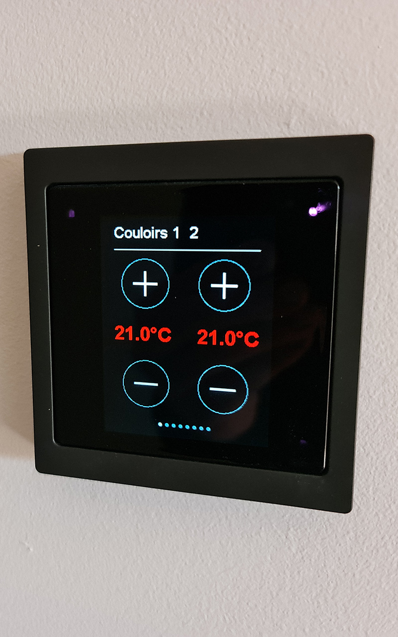 Installation full KNX, chauffage électrique par le sol pour les étages, PAC pour le RDC, 9 zones de chauffes via des thermostats KNX, 6 salles de bains et sèches serviettes connectés, alarme et détecteurs de fumés communicants, les 2 écrans tactiles ou un smartphone permettent de tout configurer, de visualiser les caméras ou de suivre la consommation du logement.